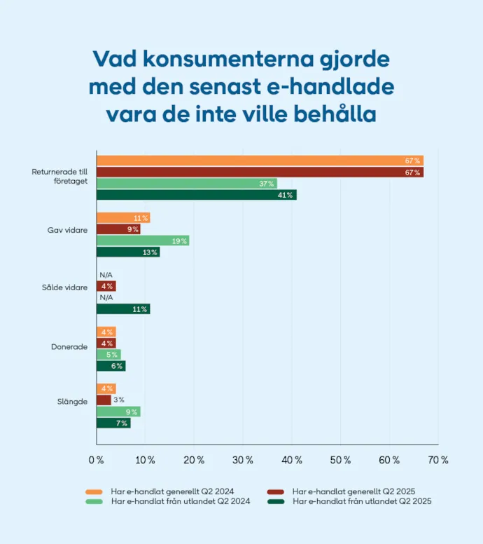 - Vi ser stora skillnader i returmönstret mellan de som e-handlar från svenska kontra utländska sajter. Till exempel slänger konsumenterna varan mer än dubbelt så ofta om de har köpt den från en utländsk sajt i stället för att returnera, sälja eller skänka vidare den. Det är dock positivt att andelen sjunkit jämfört med ifjol, säger Ylva Staszewski.